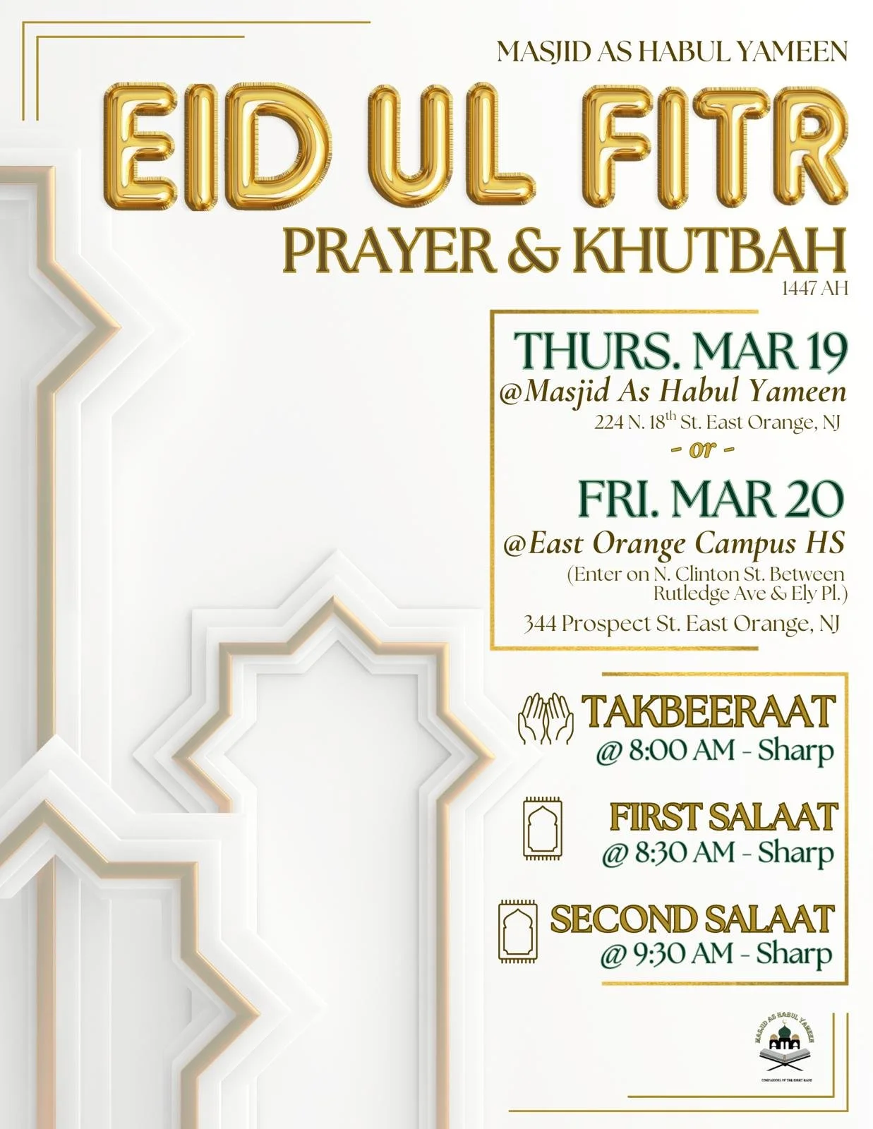 224 N 18th St, East Orange, NJ 07017 OR 344 Prospect St. East Orange, NJRamadan has finished, come out an celebrate with friends and family. We look forward to seeing you all inshâ’Allah!