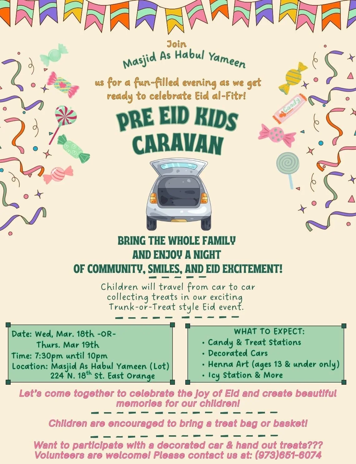224 N 18th St, East Orange, NJ 07017Bring the whole family and enjoy a night of community and Eid celebration. Children are encouraged to bring a bag or basket!